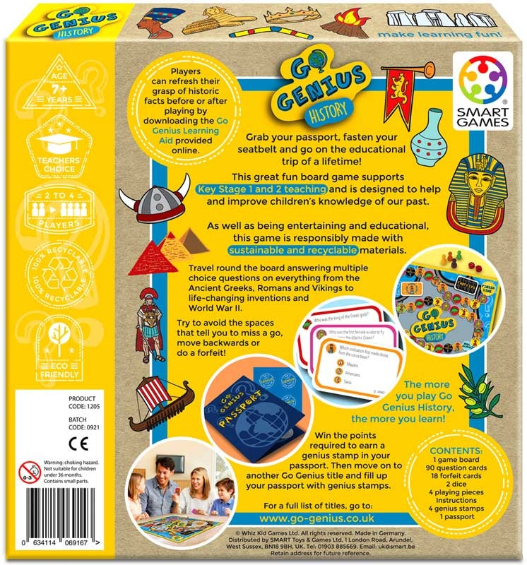 Children will take the educational trip of a lifetime with this great fun board game. It supports Key Stage 1 and 2 teaching and is designed to help and improve children's knowledge of History. As well as being entertaining and educational, Go Genius History is responsibly made with sustainable and recyclable materials. The aim of the game is get as many points as possible. Players travel round the board answering questions on everything from the Ancient Greeks, Romans and Vikings to life-changing inventions and World War II. They need to try and avoid the spaces that tell them to miss a go, move backwards or do a forfeit! Players who gain more than 15 points can put a genius stamp (provided) into their Go Genius passport (provided for children to personalise). Not everyone is a genius but the idea is the more you play the game, the more you learn. Players can also refresh their grasp of the subject by downloading a Go Genius Learning Aid online. Once players have won the points required to earn a genius stamp for Go Genius History, they can then move on to another Go Genius title and fill up their passport with genius stamps!
