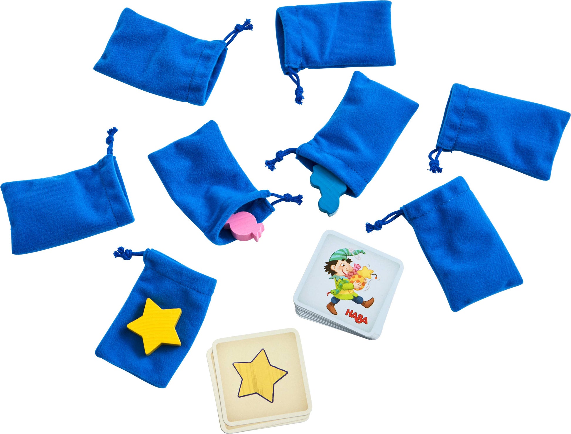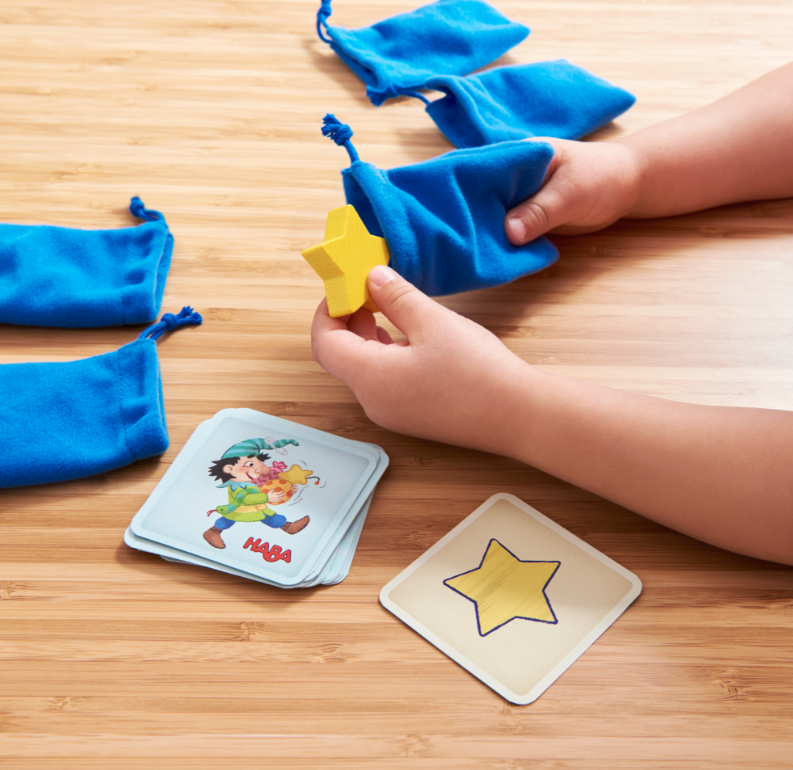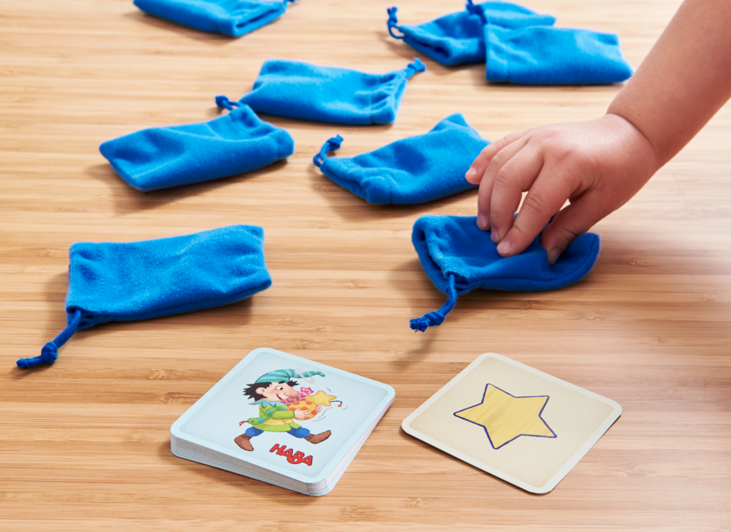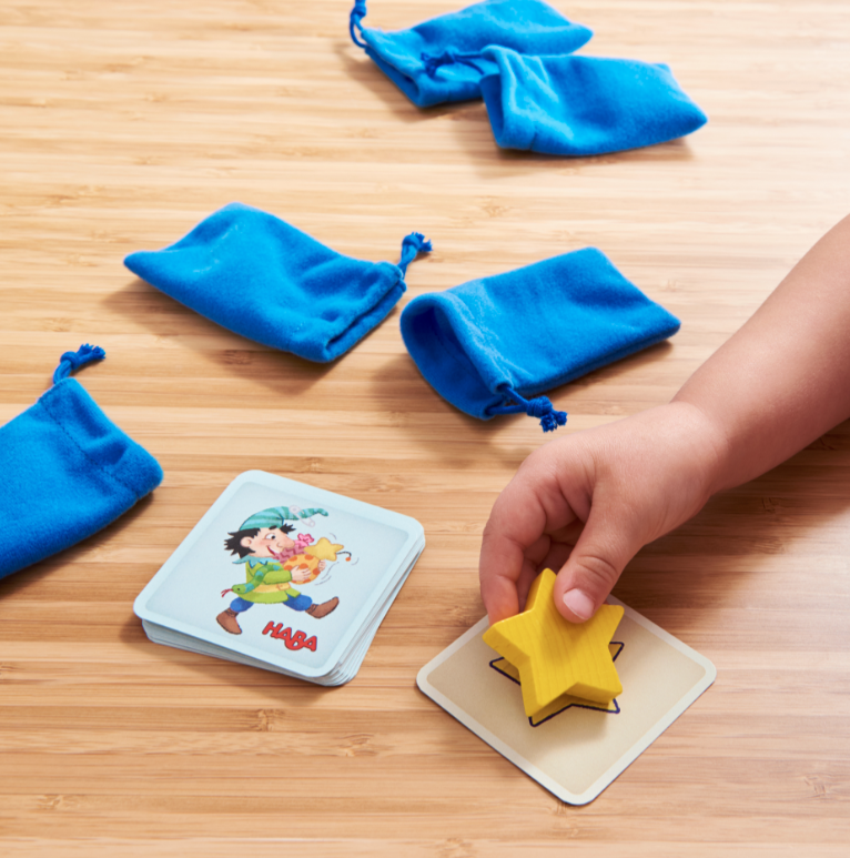 We’ve all been victims at one time or another of those brazen goblins who scurry around the nursery, when no one is looking, and hide the toys. Now players can get everything back! When everyone joins hands and calls out “Fiddle Faddle!”, the hunt is on for the missing items in the magic pouches. If a player feels for a toys and takes the wrong one, then they are out for the rest of the round. Players with sensitive fingertips can recover the correct lost toys.