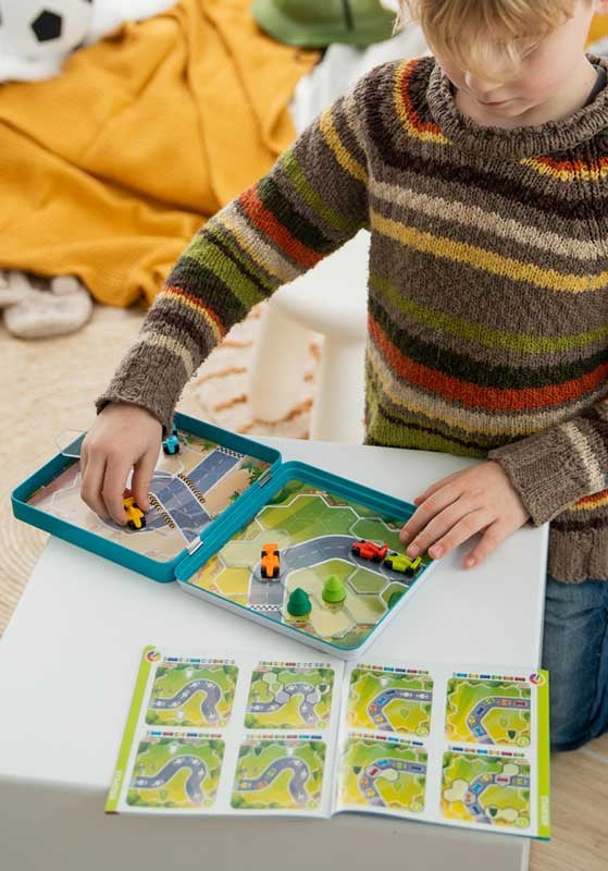 Ready to take this 3D tin travel game for a spin? Find the correct position of these magnetic racing cars and see who really hits the apex! A unique packing puzzle in a handy travel case. Become the champion of the 48 nail-biting challenges on all 6 tracks. Ladies and Gentlemen… start your (brain) engines!